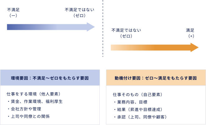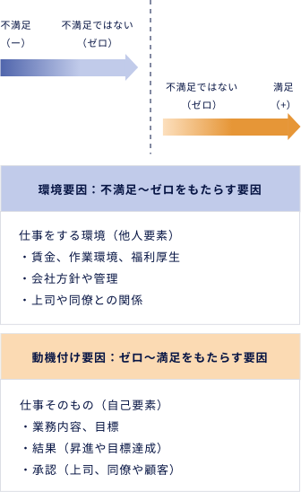 - 3.ハーツバーグ理論:満足/不満足に連続性はない。「動機づけ要因と環境要因」を考えるべきという考察。